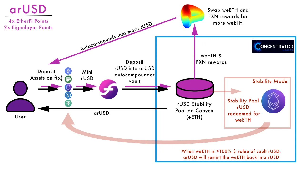 **arUSD** is the tokenized version of rUSD EtherFi Stability Pool vaults from Convex Finance. Why eETH? We believe EtherFi’s eETH is the most liquid and reliable LRT! Why Convex vaults? Boosted yield! Since Convex it’s a big veFXN holder, it provides the highest yield on f(x)’s Stability Pools.